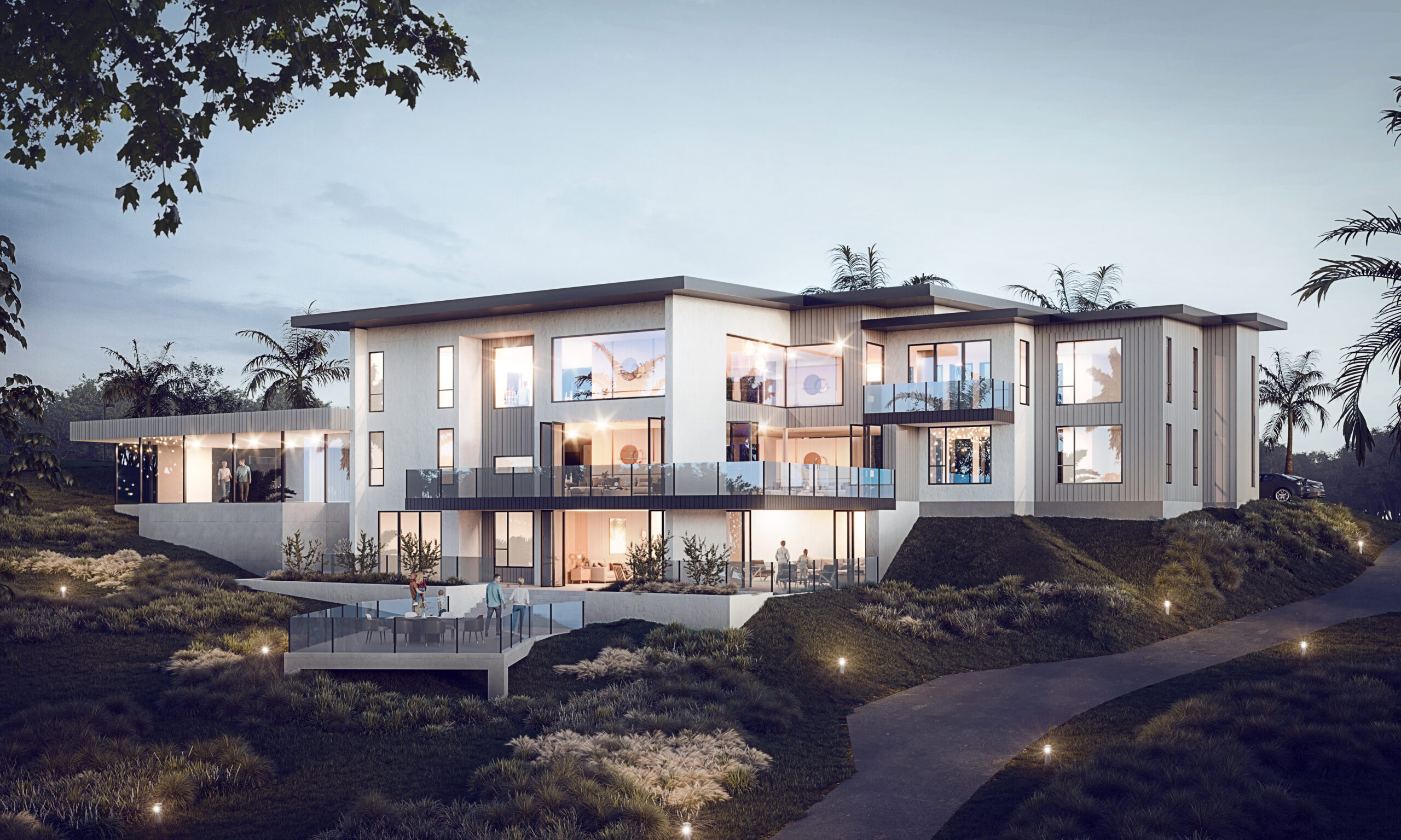 At the back, the home opens fully to the landscape with expansive glazing, wraparound balconies, and generous outdoor terraces. Stepping naturally with the sloped site, the rear elevation maximises light, views, and indoor–outdoor flow, creating a resort-style living experience across all levels.